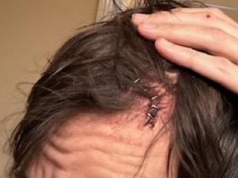 laceration of the scalp requiring eight staples, a cracked rib, and