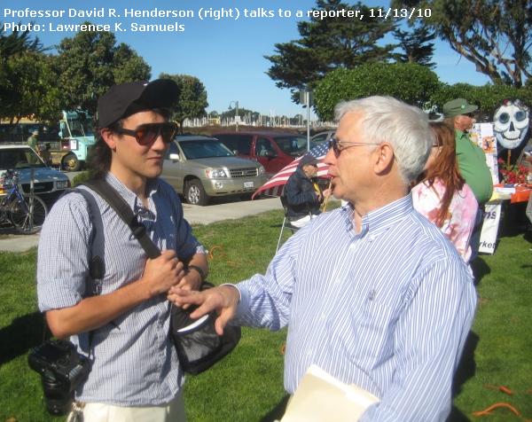 The keynote speech on November 13, 2010, was delivered by California Assemblyman Bill Monning, but the most well-received speech came from David R. Henderson, professor of economics at the Naval Postgraduate School, and co-chair of Libertarians for Peace of Monterey County.